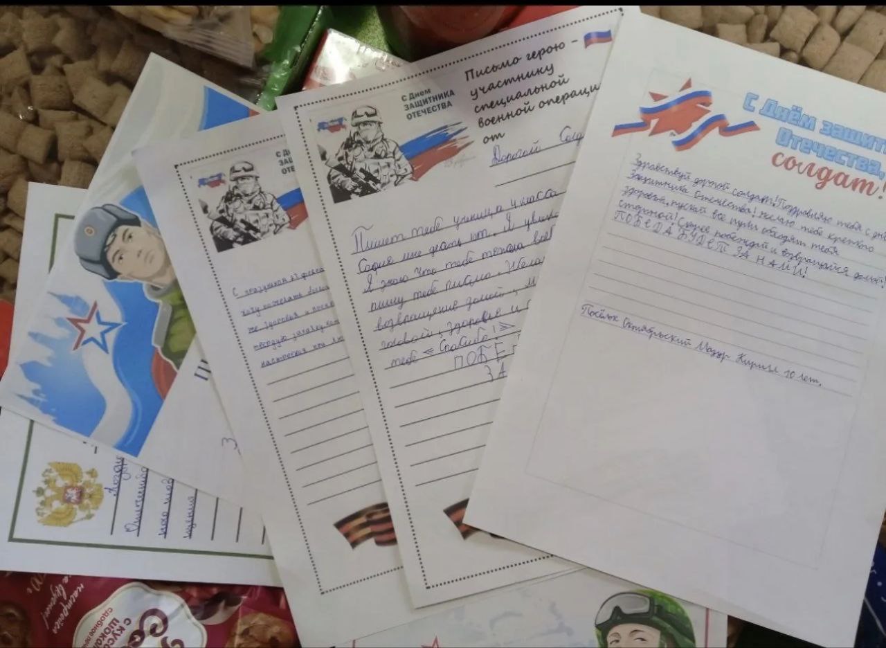 Ребята своими руками сделали открытки с праздником 23 февраля,подготовили письма,  наполненные теплыми словами признательности и глубокой благодарности за мужество и героизм, с пожеланиями вернуться к своим семьям живыми, здоровыми и обязательно с Победой!
