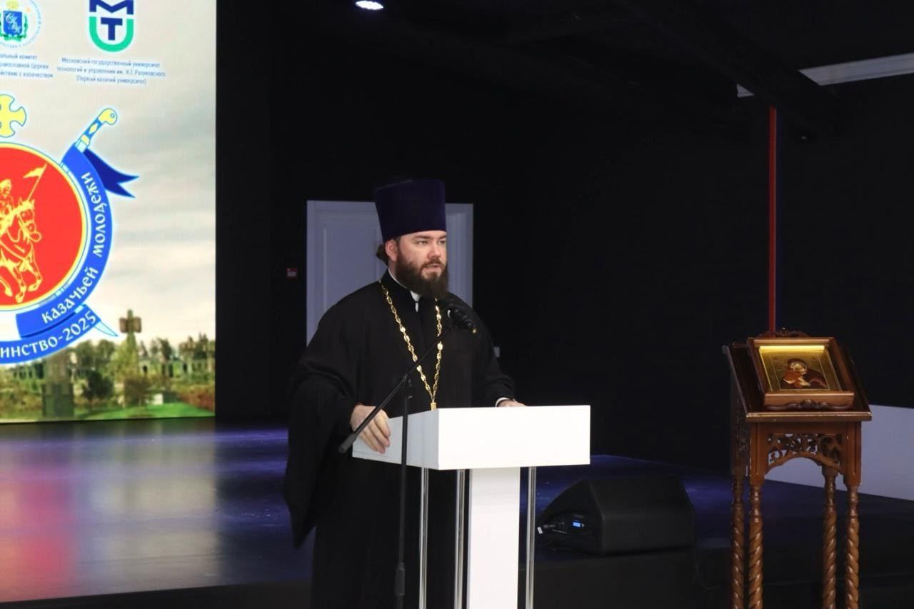 По традиции, мероприятие началось с молитвы и благословения ответственного секретаря Синодального комитета Русской православной церкви по взаимодействию с казачеством иерея Тимофея Чайкина.