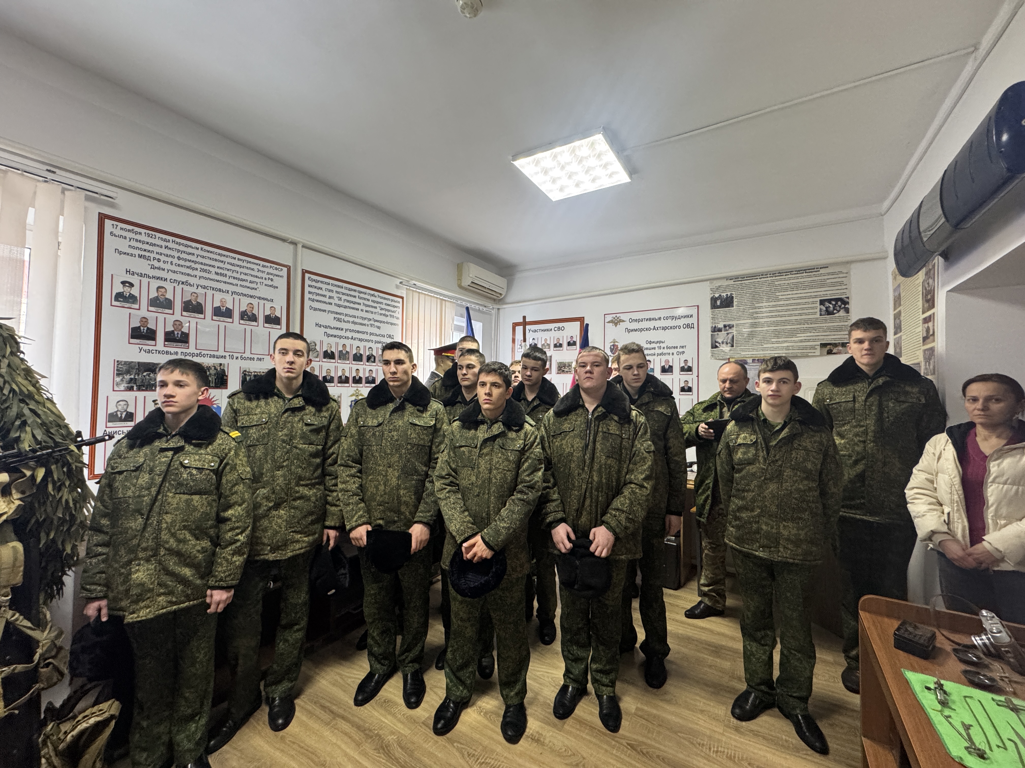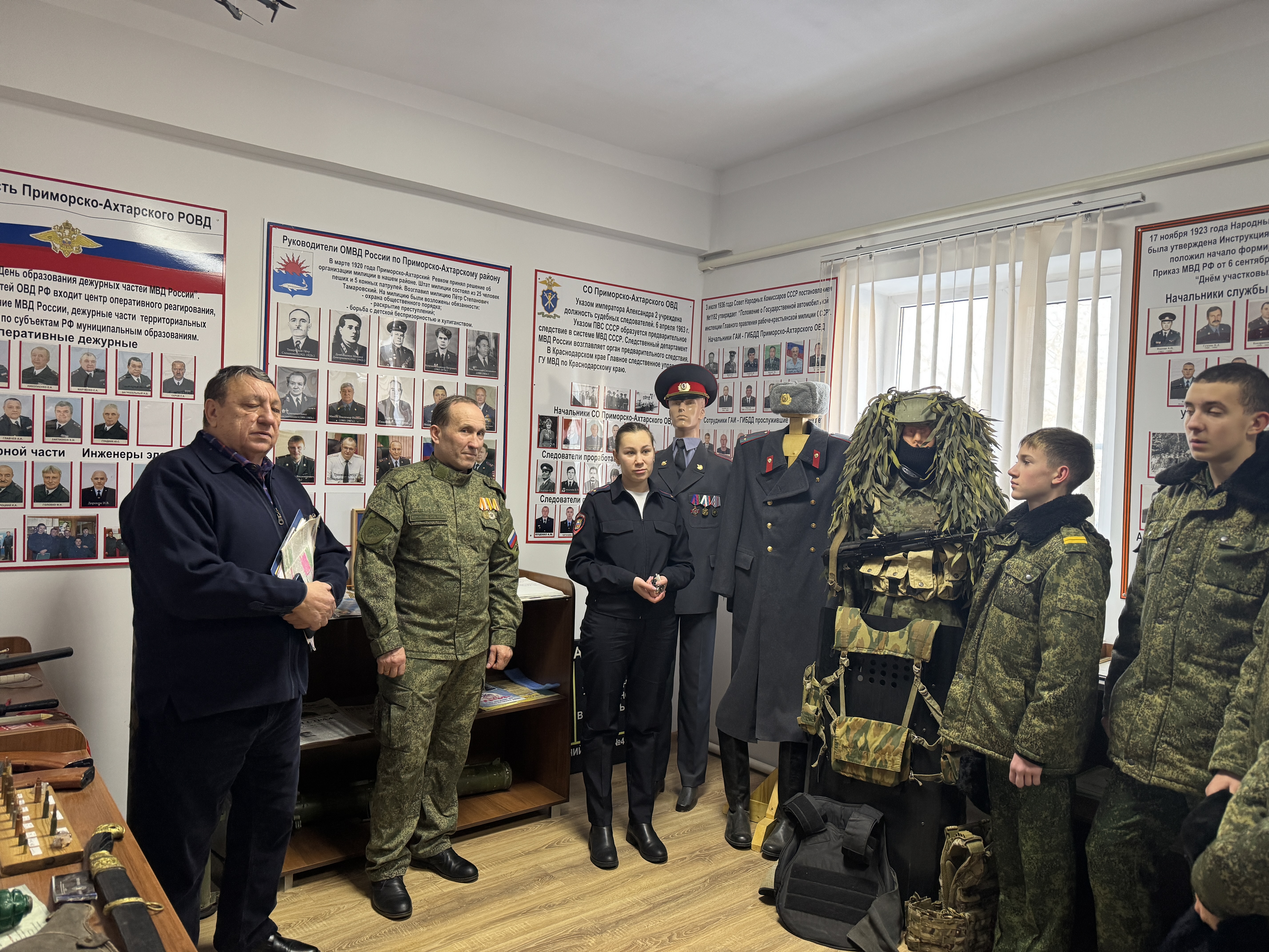 Инспектор ПДН совместно с председателем Совета ветеранов Отдела МВД полковником милиции в отставке Александром Очередько и ветераном ОВД, участником боевых действий Виталием Евсюковым, организовали обширную экскурсию в музее Отдела МВД России по Приморско-Ахтарскому району для учащихся кадетского корпуса.