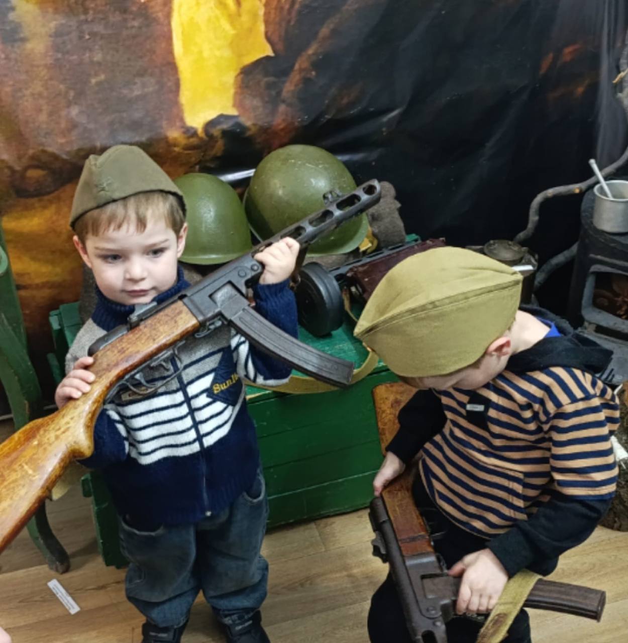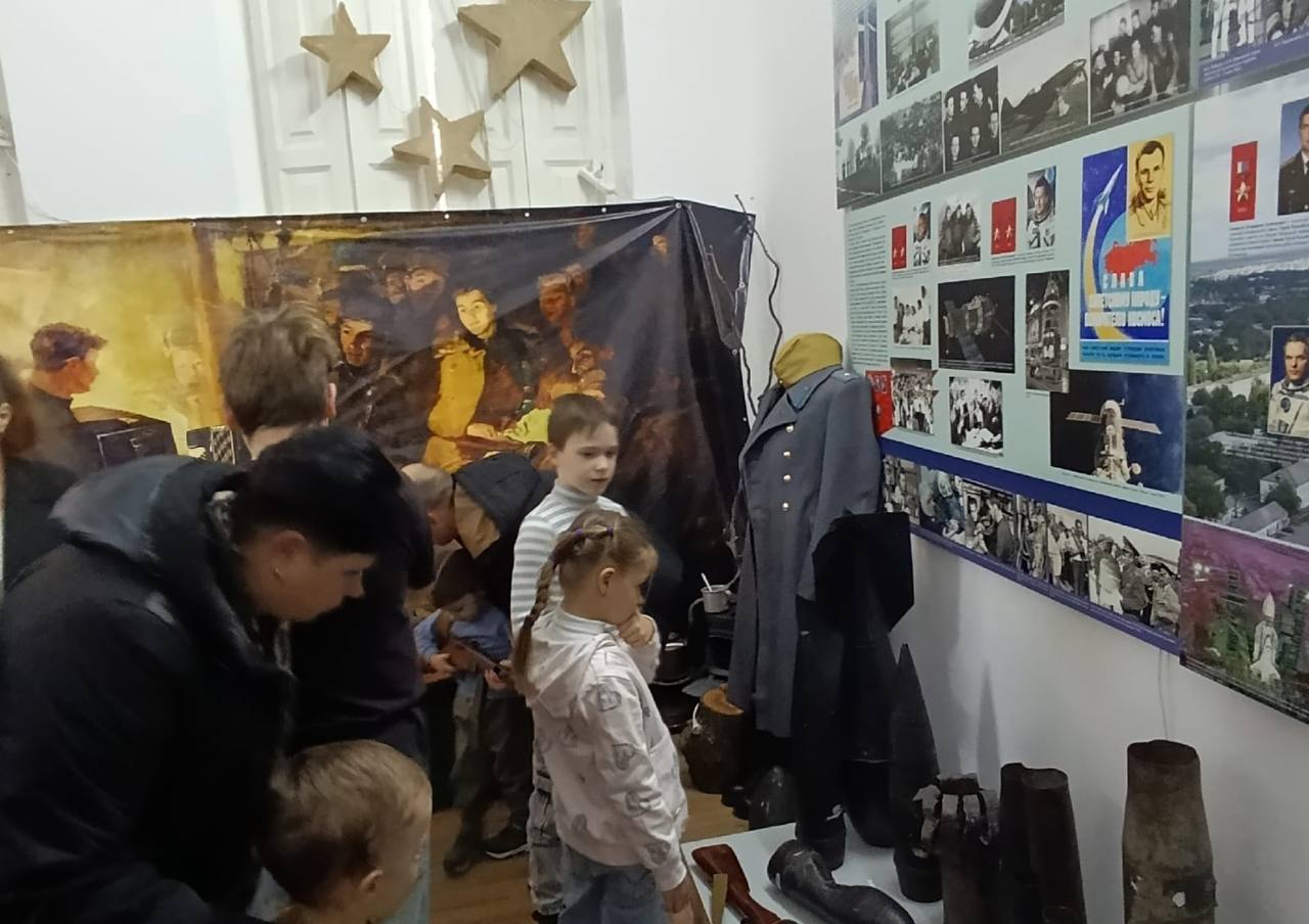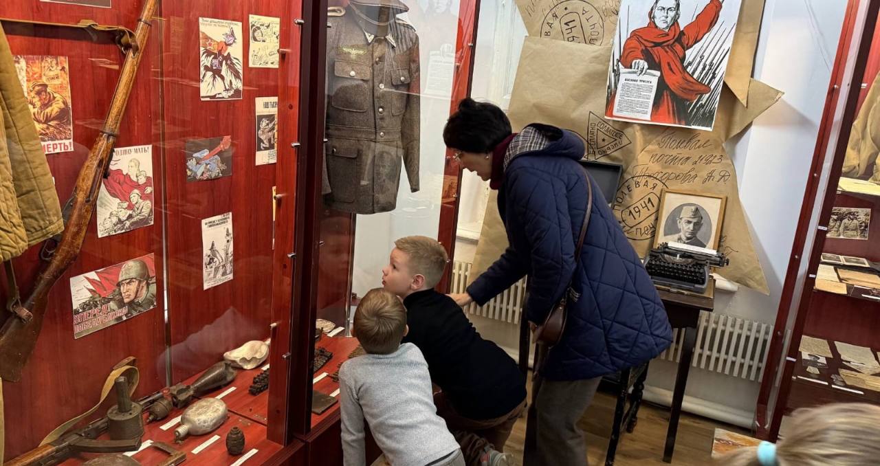 Дети и взрослые с большим интересом слушали рассказ экскурсовода, рассматривали экспонаты. Среди них каски, фляжки, шинель, личные вещи участников Великой Отечественной войны.
