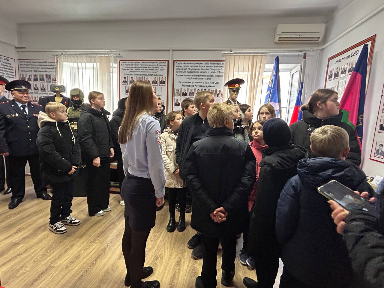 Экскурсия началась у мемориальных плит памяти погибших сотрудников, земляков военных-конфликтах и служебной собаки по кличке «Елга». Затем ребята проследовали в музей, где председатель Ассоциации ветеранов боевых действий ОВД и ВВ России по Приморско-Ахтарскому району капитан полиции в отставке Кравченко В.М. и капитан полиции в отставке Яковлевым В.Н. рассказали об истории отдела внутренних дел Приморско-Ахтарского района, о ее сотрудниках и ветеранах, а та же показали детям музейные экспонаты, стенды с историческими документами.