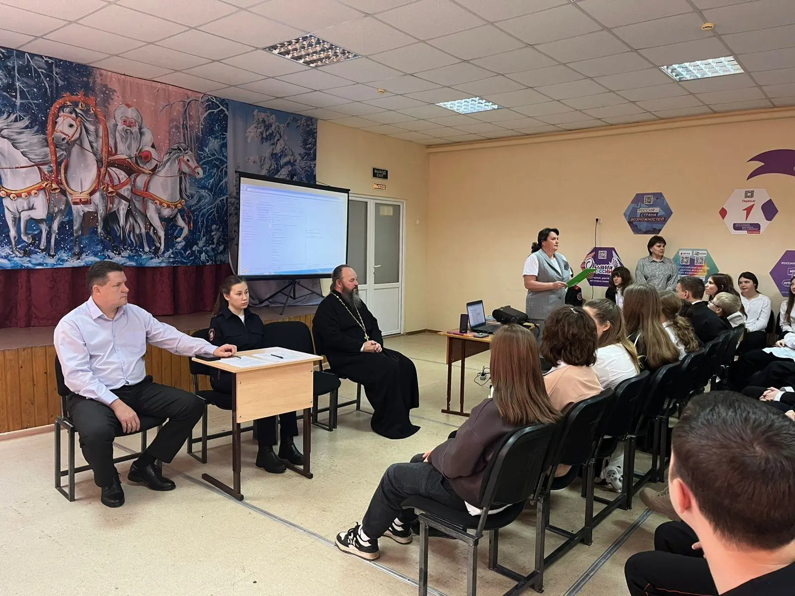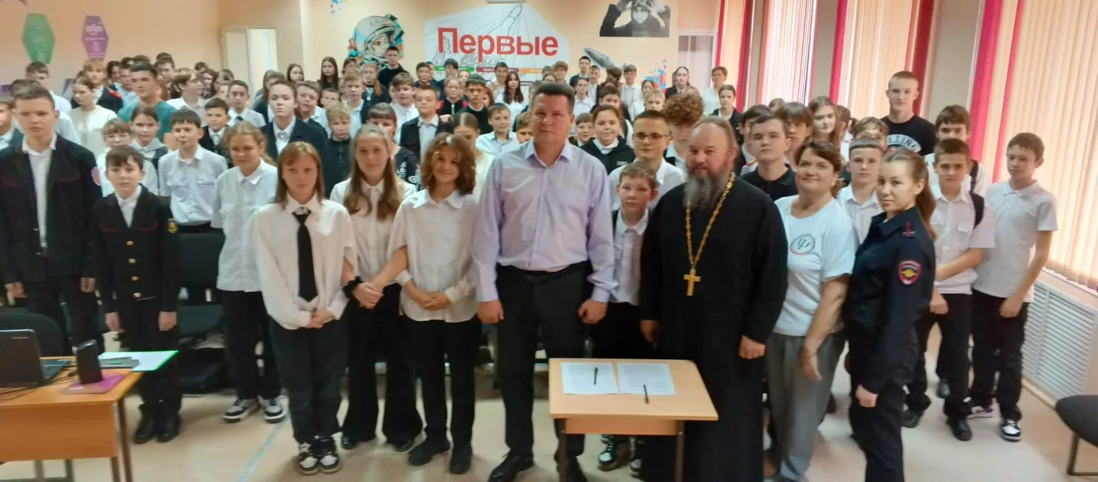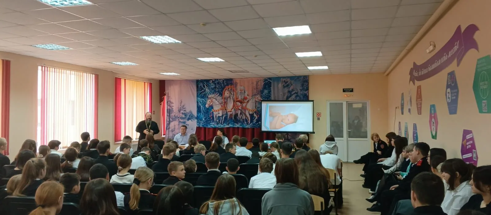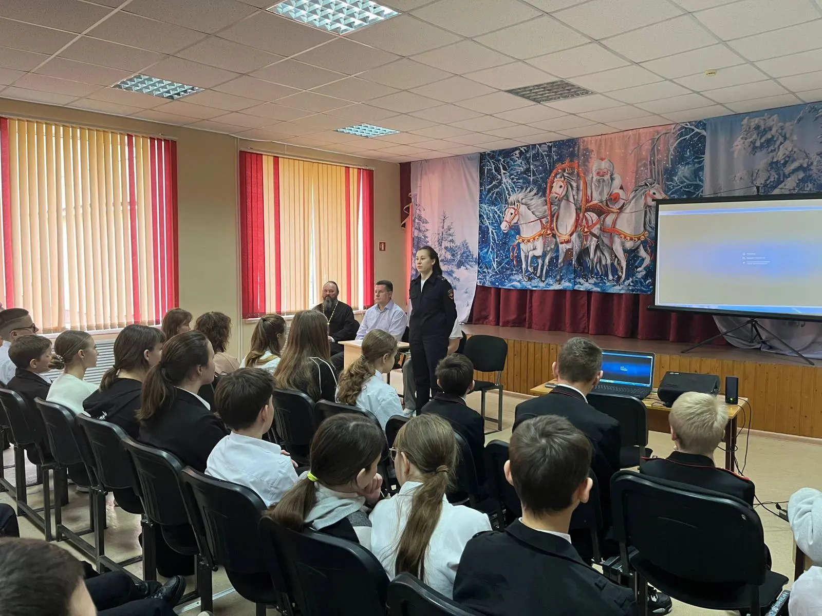 В беседе участвовал настоятель храма Святого Георгия Победоносца, иерей Сергий Ревякин, который вместе с детьми вспомнил священные заповеди: "Полюбите ближних Ваших: родителей, братьев и сестёр, людей, окружающих Вас. Соблюдайте режим питания, будьте сильны и здоровы духом!" . Отец Сергий пригласил детей и их родителей в храм, поздравил с наступающими зимними праздниками.