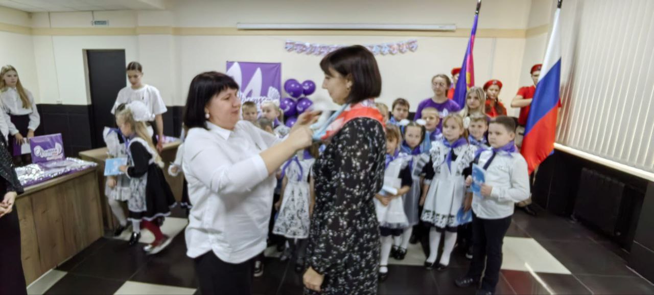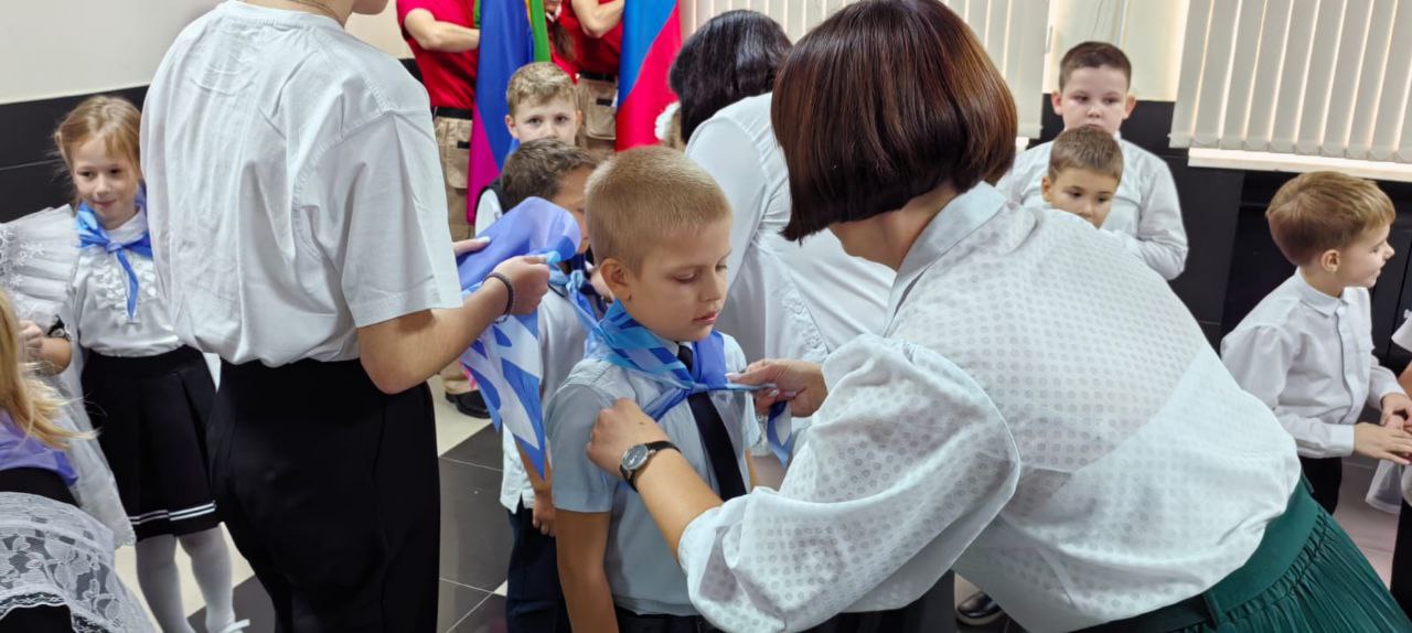 После прочтения торжественного обещания, ребятам повязали галстуки и выдали значки с удостоверениями.