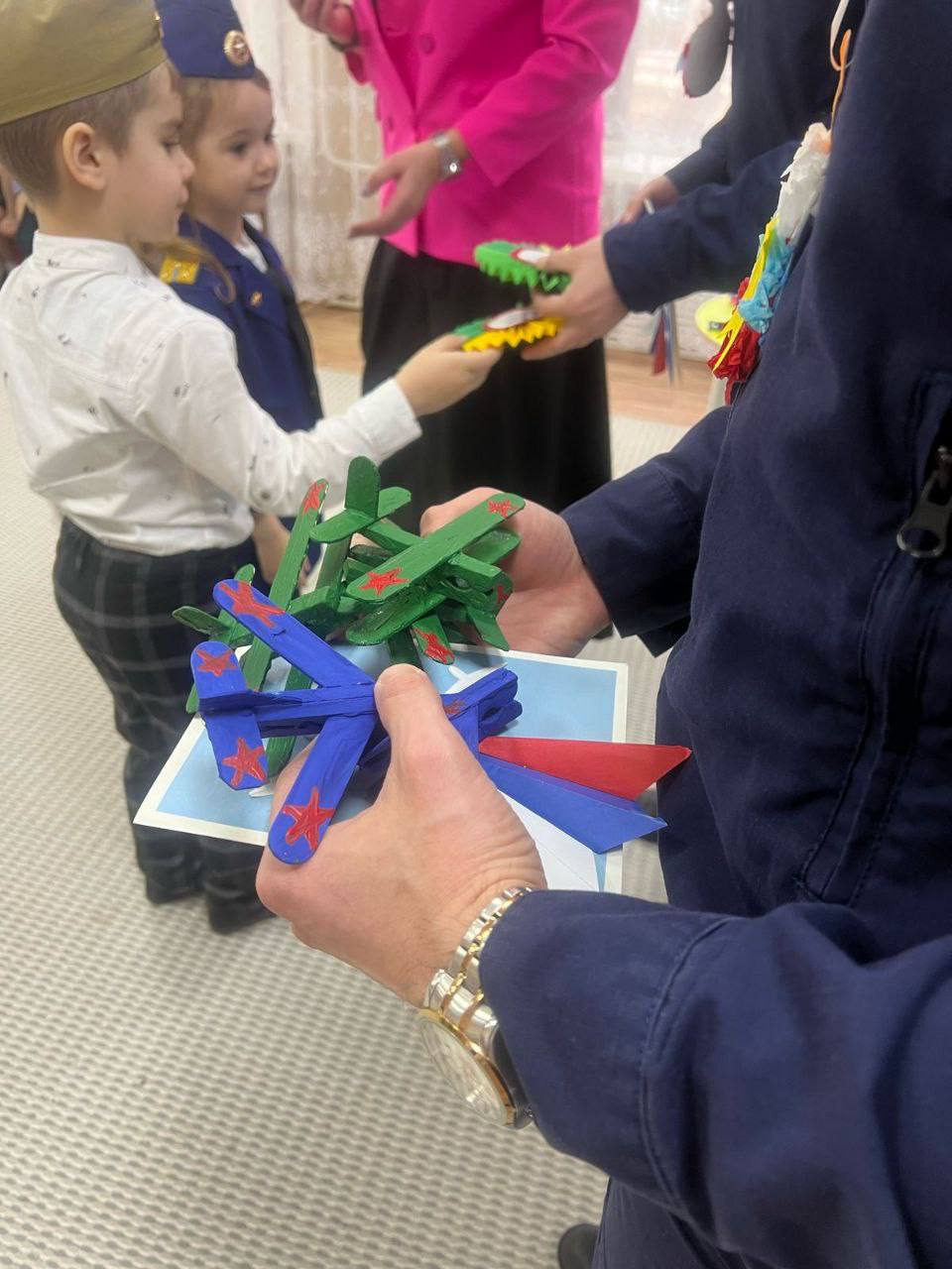 Ребята подготовили для военнослужащих праздничный концерт, подарили им и их коллегам открытки и поделки, сделанные своими руками, вручили медали и торт, изготовленный в цветах мирного неба.