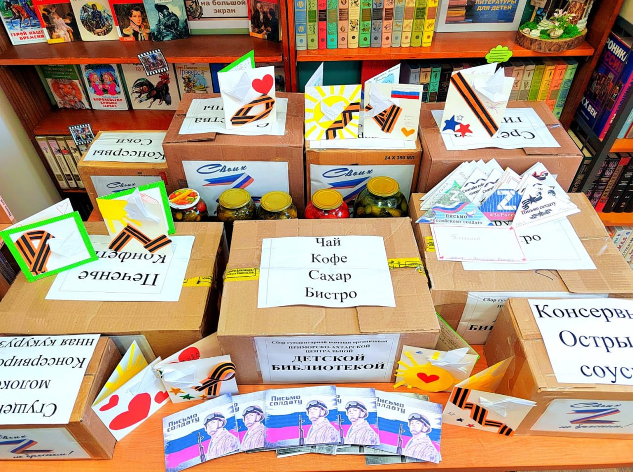 В течение месяца в детской библиотеке проходил сбор гуманитарной помощи участникам СВО, в котором приняли участие библиотекари, педагоги, пенсионеры и дети. Собраны письма, поздравительные открытки, предметы первой необходимости, теплые вещи, продукты.